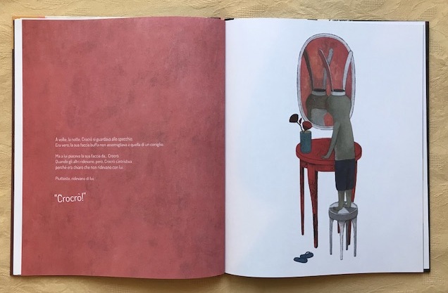 Sarà un percorso di scoperta che passerà dalla pagine bianche alla pagine monocromatiche alternate, rosse o nere, in cui Crocrò dovrà trovare la forza di guardarsi allo specchio, cioè nel cuore della suo stato di sofferenza, per arrivare ad abitare la sua vera natura, sulle rive dello stagno, un luogo dove scopre di appartenere a una unicità ricca, preziosa, capace di entrare in relazione proprio per quello che è.
